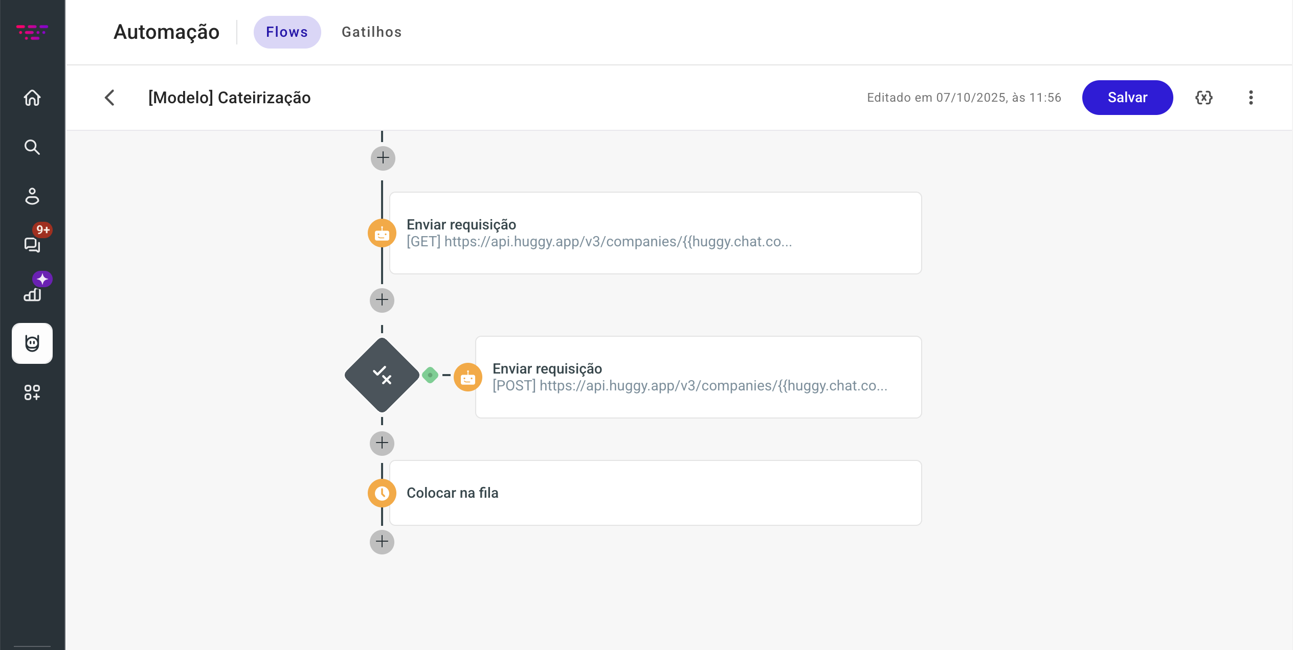 Agora, vamos adaptar as ações do flow para que ele reconheça a variável do campo personalizado que você criou e também o token de API.