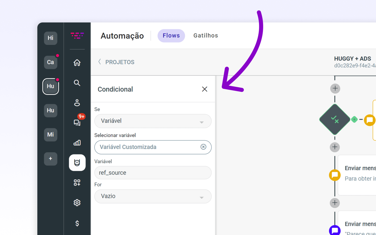 Ao receber conversas originadas de anúncios Click to WhatsApp, a Huggy disponibiliza variáveis de contexto que armazenam dados cruciais sobre a origem do lead.